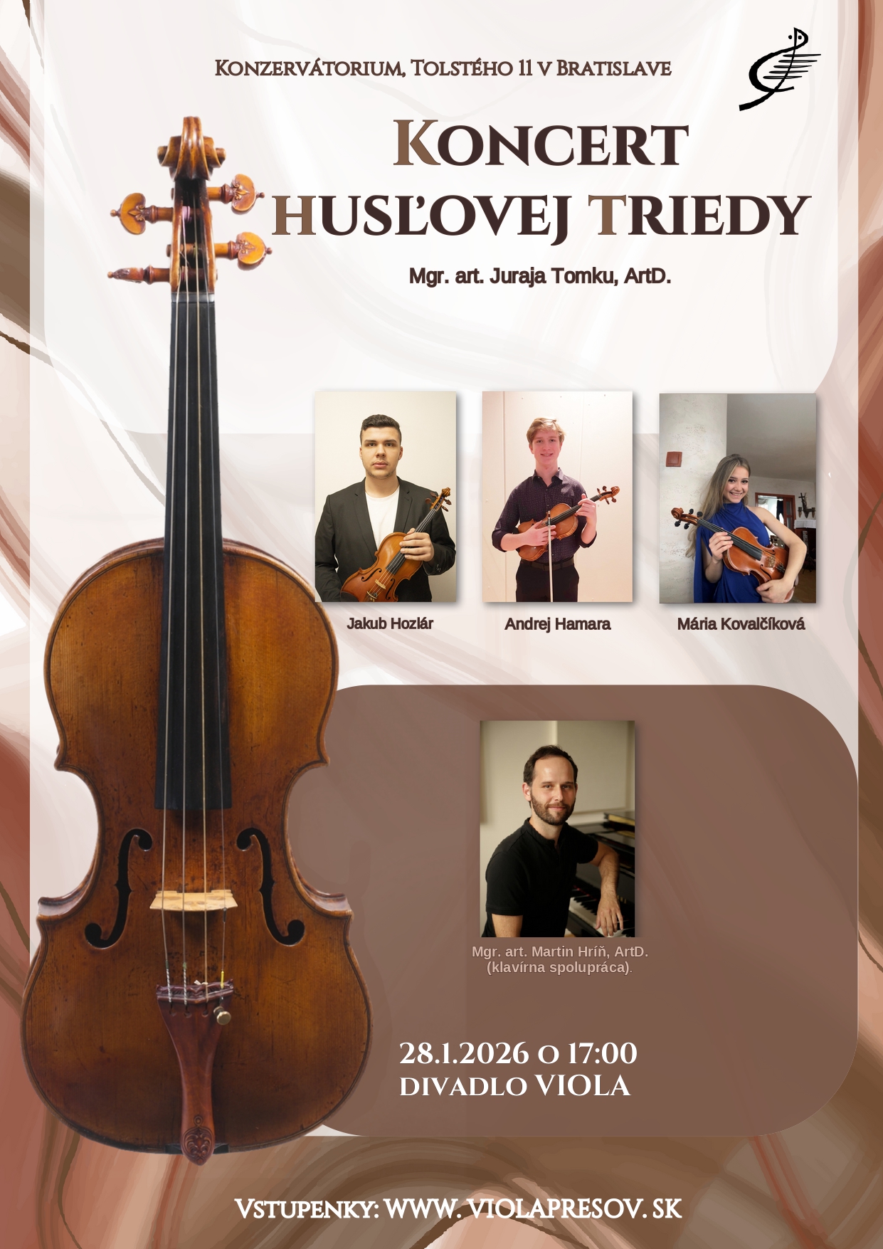 Koncert študentov Konzervatória, Tolstého 11 Bratislava z triedy Mgr. art. Juraja Tomku, ArtD. bude obsahovať skvosty husľovej literatúry 19. storočia. Vystúpenie otvorí Andrej Hamara (4. ročník) prvou, úvodnou časťou Koncertu pre husle a orchester č. 1 g mol, op. 26 od nemeckého romantického skladateľa Maxa Brucha, ktorá je plná krásnych melódií aj dramatických vzplanutí. V jeho interpretácii si vypočujeme aj vtipné a bravúrne Zapateado, op. 23 od španielskeho skladateľa a virtuóza Pabla de Sarasateho. V duchu virtuozity sa bude niesť koncert ďalej vo vystúpení Jakuba Hozlára (5. ročník), ktorý predvedie Capriccio č. 5 od talianskeho husľového mága Niccola Paganiniho. Spolu s klaviristom Mgr. art. Martinom Hríňom, ArtD. zahrajú 1. časť Kreutzerovej sonáty pre klavír a husle č. 9 A dur, op. 47 od Ludwiga van Beethovena, ktorá je autorovou najvýraznejšou a najhlbšou kompozíciou svojho druhu. V druhej polovici sa predstaví študentka Mária Kovalčíková (2. ročník), ktorá predvedie Koncert pre husle a orchester č. 3 h mol, op. 61 od francúzskeho skladateľa Camilla Saint-Saënsa. Koncert sa skladá z troch tempovo kontrastných častí. Prvá časť je dramatická a plná dychberúcej sólistickej virtuozity. V druhej, pomalej časti sa dostane k slovu francúzsky šarm a elegancia a tretia časť je brilantnou tarantelou, ktorá privedie celý koncert k víťaznému záveru.