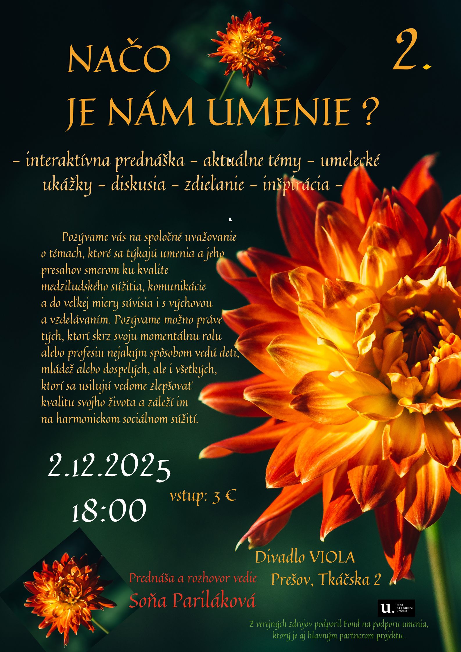 - interaktívna prednáška - aktuálne témy - umelecké ukážky - diskusia - zdieľanie - inšpirácia -