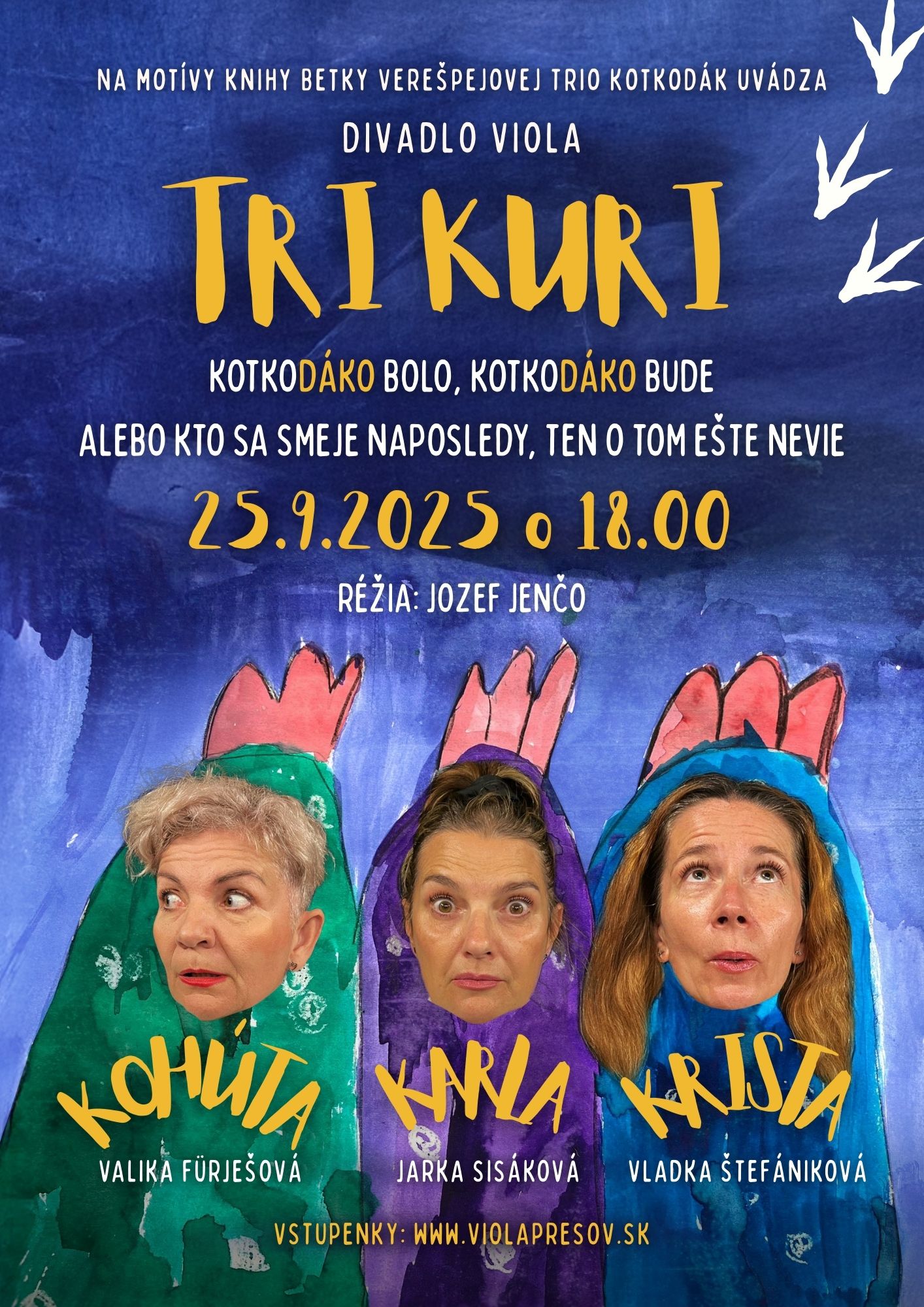 Kotko-kotko-komédia o troch sliepkach z knihy Betky Verešpejovej Trio Kotkodák, ktoré vyleteli z dvora (aj z diela) a svojim humorom trhajú kohútiky.