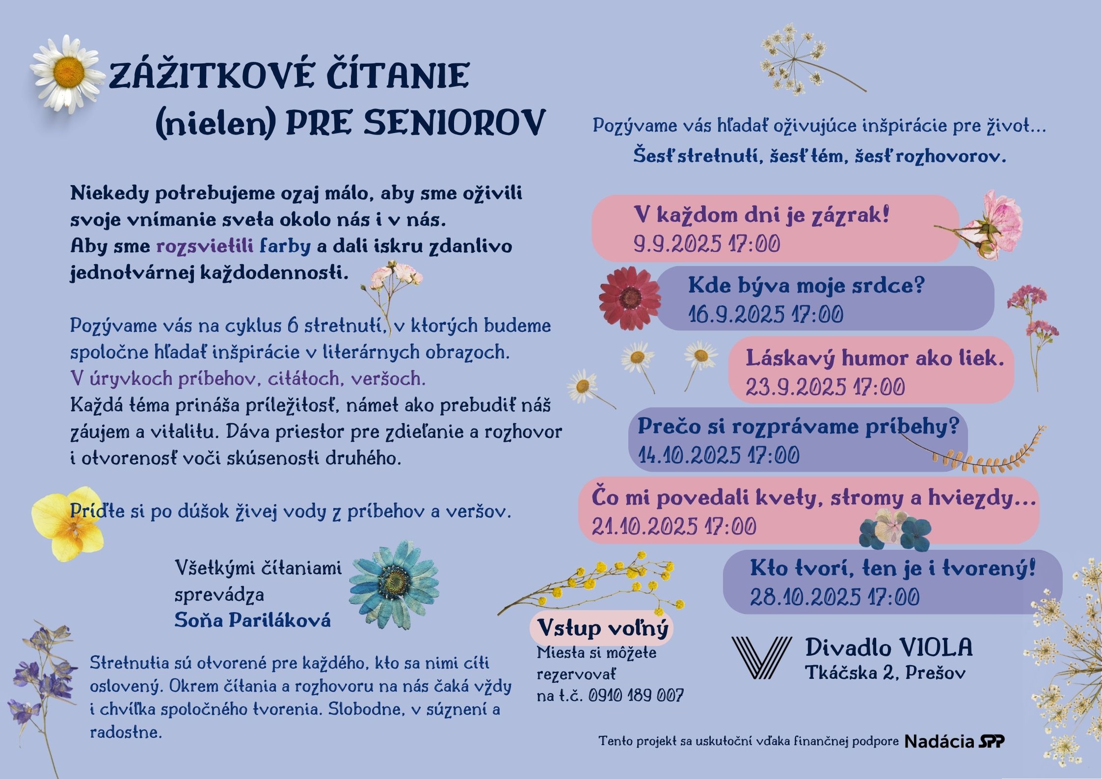 Niekedy potrebujeme ozaj málo, aby sme oživili svoje vnímanie sveta okolo nás i v nás. Aby sme rozsvietili farby a dali iskru zdanlivo jednotvárnej každodennosti. Pozývame vás na šieste z cyklu 6 stretnutí, v ktorých spoločne hľadáme inšpirácie v literárnych obrazoch. V úryvkoch príbehov, citátoch, veršoch. Každá téma prináša príležitosť, námet ako prebudiť náš záujem a vitalitu. Dáva priestor pre zdieľanie a rozhovor i otvorenosť voči skúsenosti druhého.
